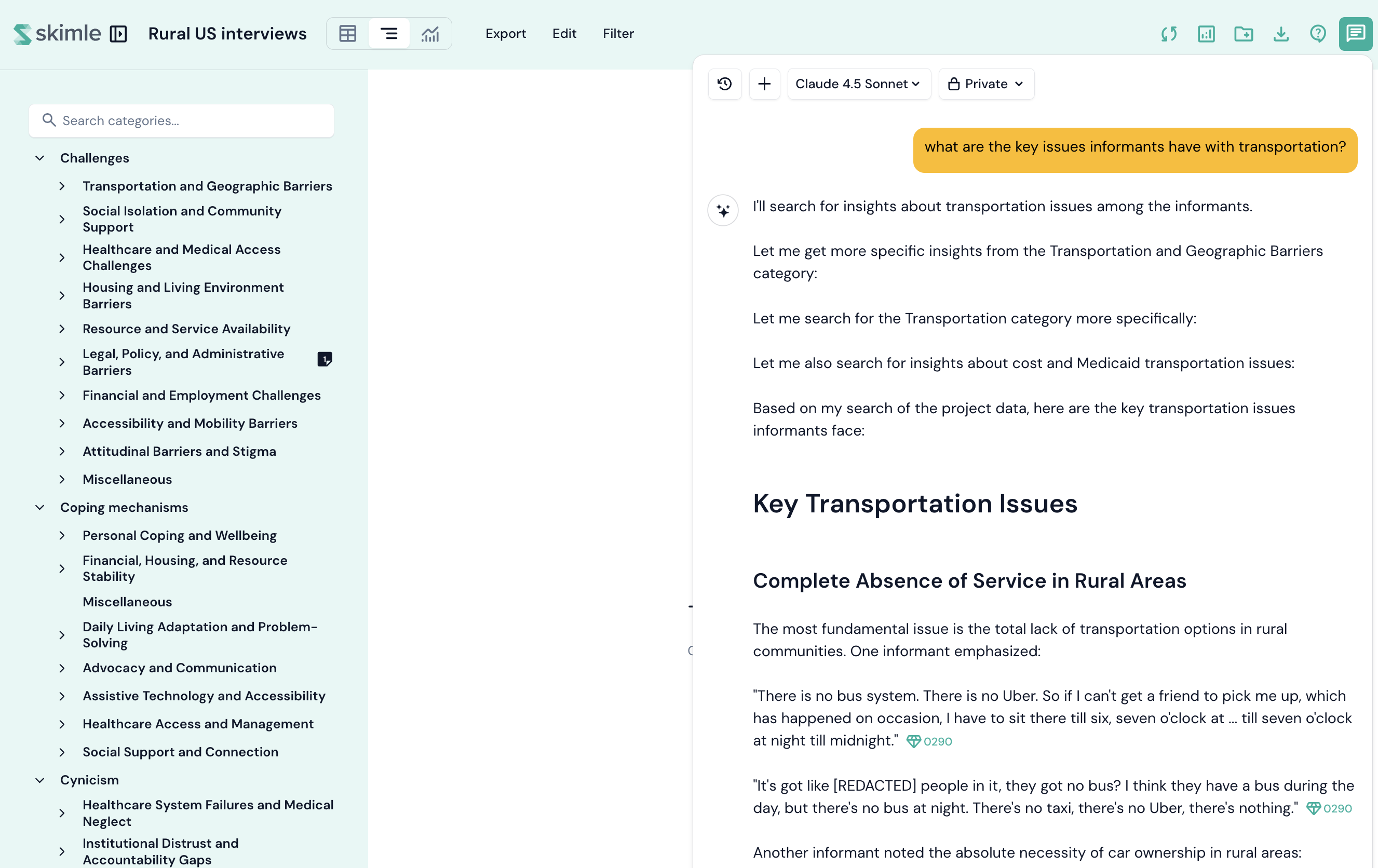 Skimle has a powerful agentic AI chat that can access the original documents as well as the category structure, insights, and summaries.