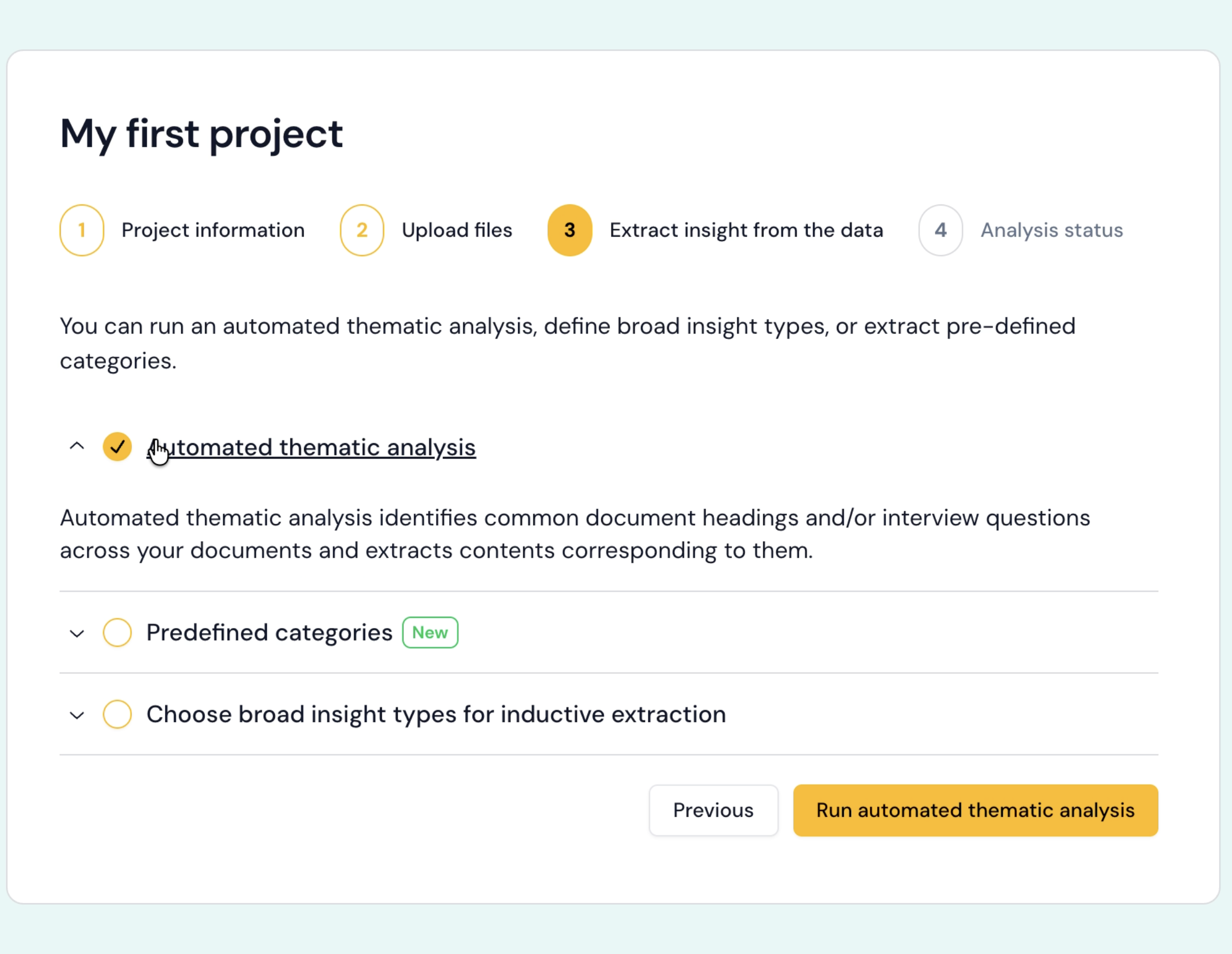 For your first project, just choose the automatic thematic analysis. It creates a good structure based on the headings or questions in your documents. It is ideally suited for interview data.