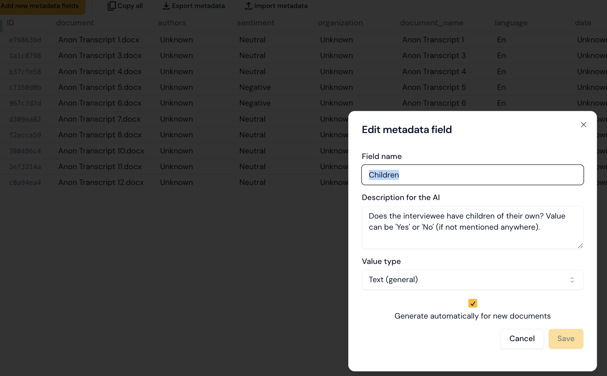 Metadata fields let you attach structured information to each document in your project, such as participant demographics, interview dates, or organisational details. You can add metadata manually, import it from a spreadsheet, or let AI generate it automatically.