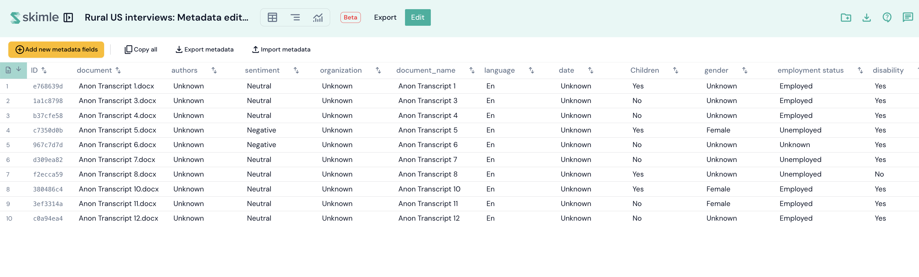 One neat trick is to export metadata as an Excel file, edit the values (and add new columns if needed), and then import back into Skimle.