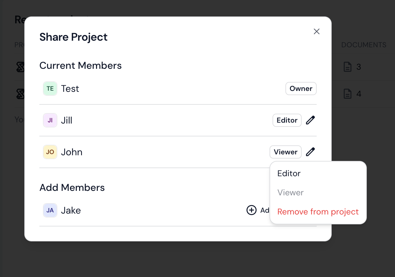 You can add your team members to the project by clicking the "Add to project" button and selecting the appropriate rights.
