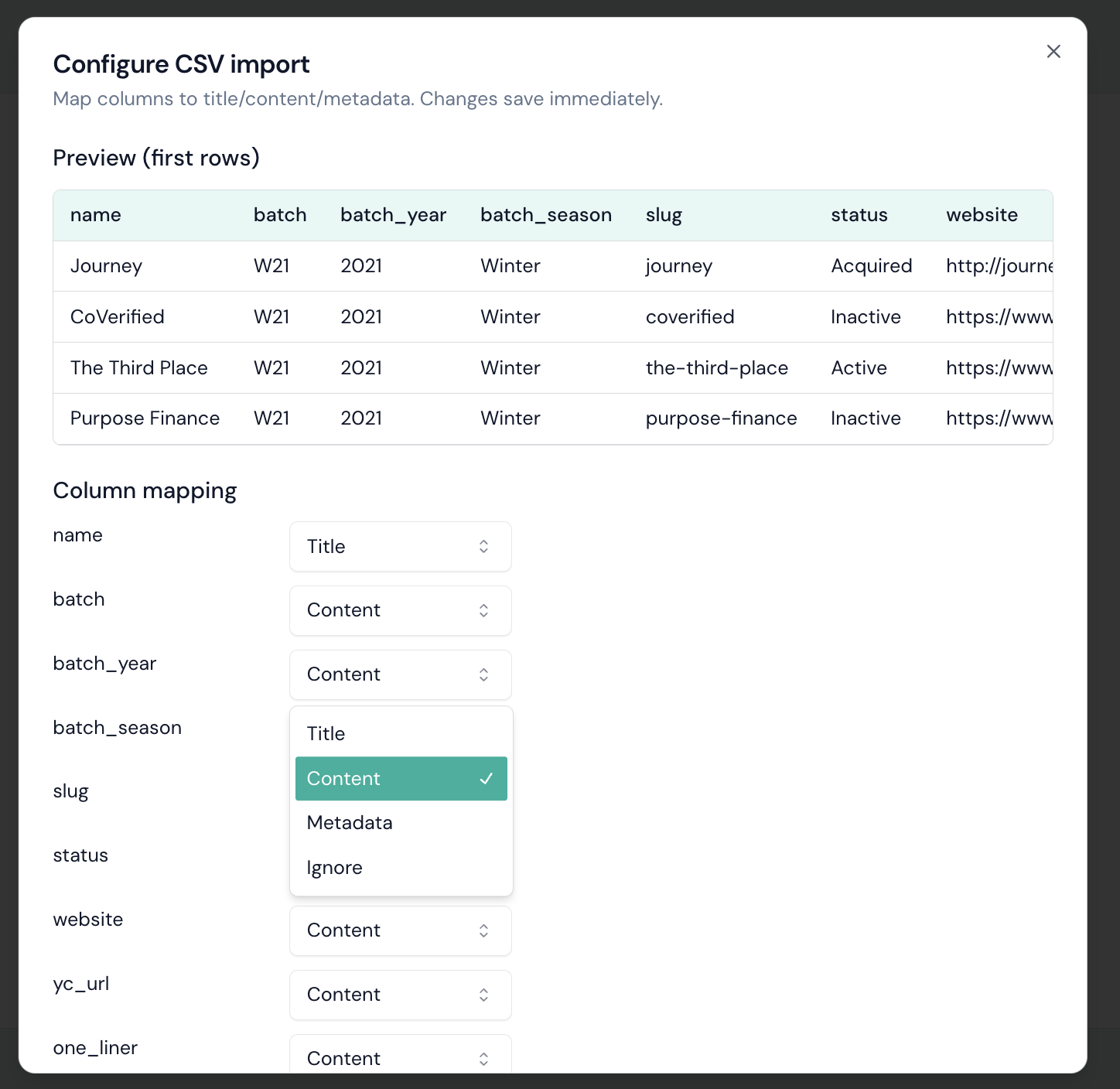 For each column, you can choose whether it is included as content inside your document, as a metadata field, or ignored. You may want to edit the column headings before importing, as the first row of the CSV or Excel file is used to create section headings and metadata field names.