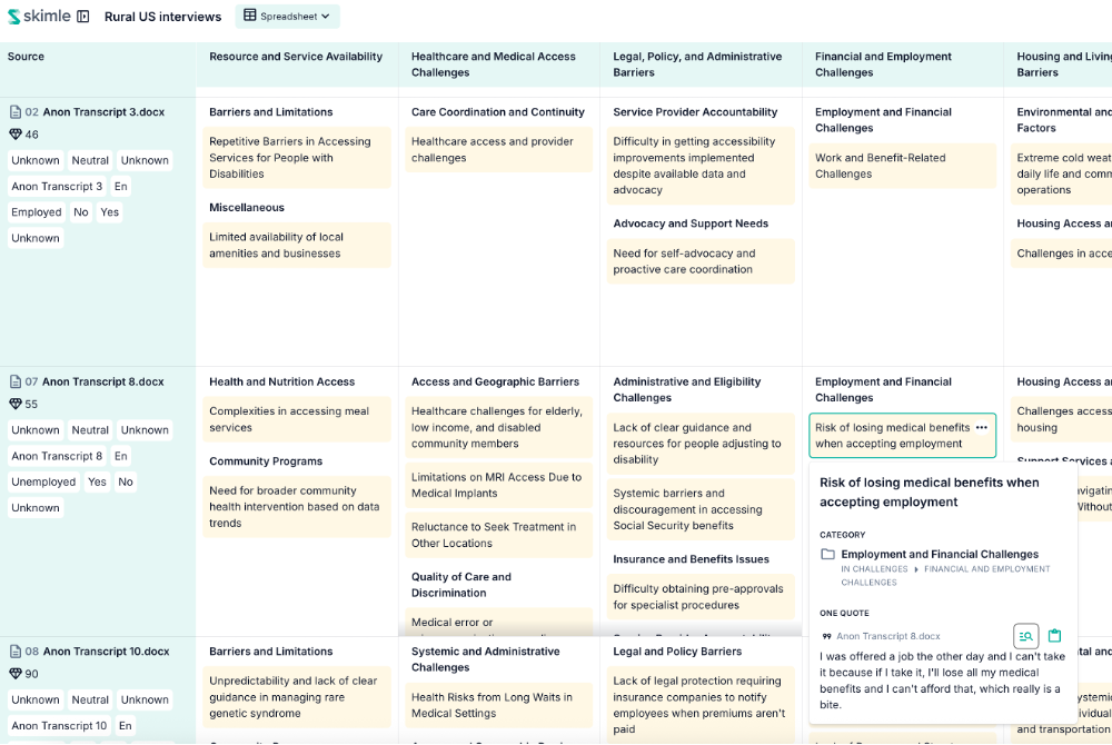 Initial coding of interviews can take weeks manually. Skimle does this without sacrificing methodological rigour, often catching quotes that a human would miss.